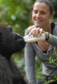 Rachel is from Birmingham (and still has her lovely soft Brummie accent!) but has been in Cameroon for the last ten years. She always wanted to work closely with primates and in particular gorillas. She started off as a volunteer and was meant to go home after a couple of months; but then the arrival of a fragile, 2-week old gorilla changed that and she didn’t have the heart to leave. Rachel gave up her life in the UK to nurse him back to health and has not looked back since. This is Nkan fit and healthy as a juvenile gorilla.