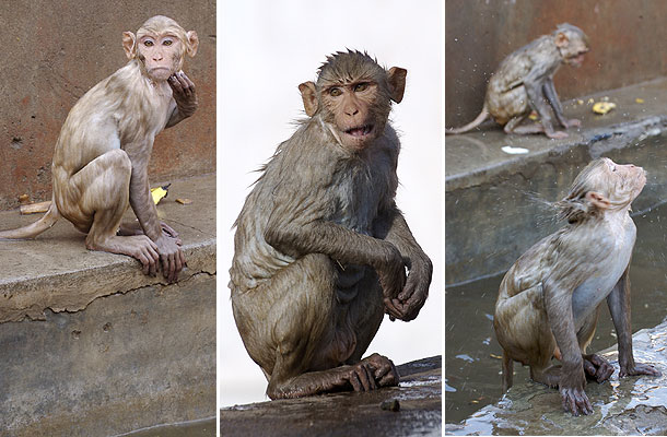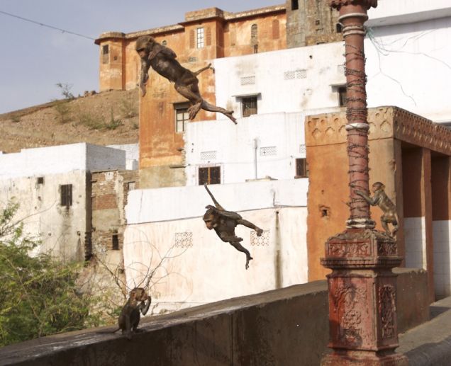 These mischievous macaques in Jaipur, India, were snapped tombstoning by a photographer, Andrew Forsyth. Even though the water was quite shallow, which could have caused injury or death on impact, the monkeys repeatedly threw themselves off a 3.5m (12ft) lamp-post into the trough of water.