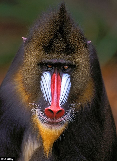 New research published by scientists from Durham University shows a Mandrill captured on film, stripping a twig and using it as a tool to clean under its toenails. These are magnificent looking monkeys and the depth of colours differ depending on the sex. Males have an orange/yellow beard and an unmistakable bright red-and-blue snout and rump. Females have a duller blue snout and a buffy beard.