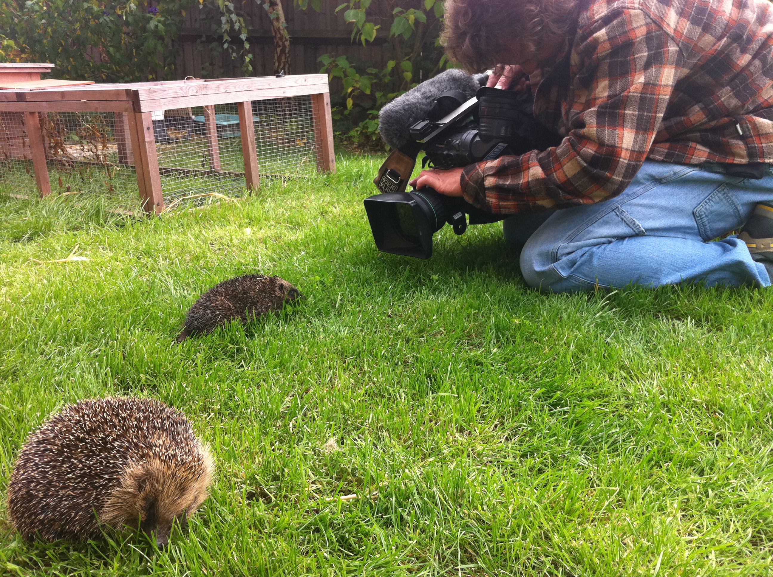 Stuart Webb ITN's cameraman getting up close and personal with hedgehogs in Oxfordshire
