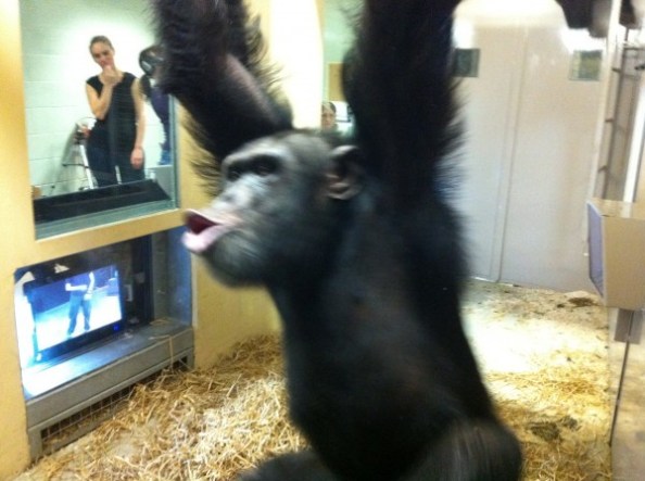 Mayeri screened the film for the chimpanzee community at Edinburgh Zoo (using a special animal-proof TV, chimps are five times stronger than man) and filmed their reactions.