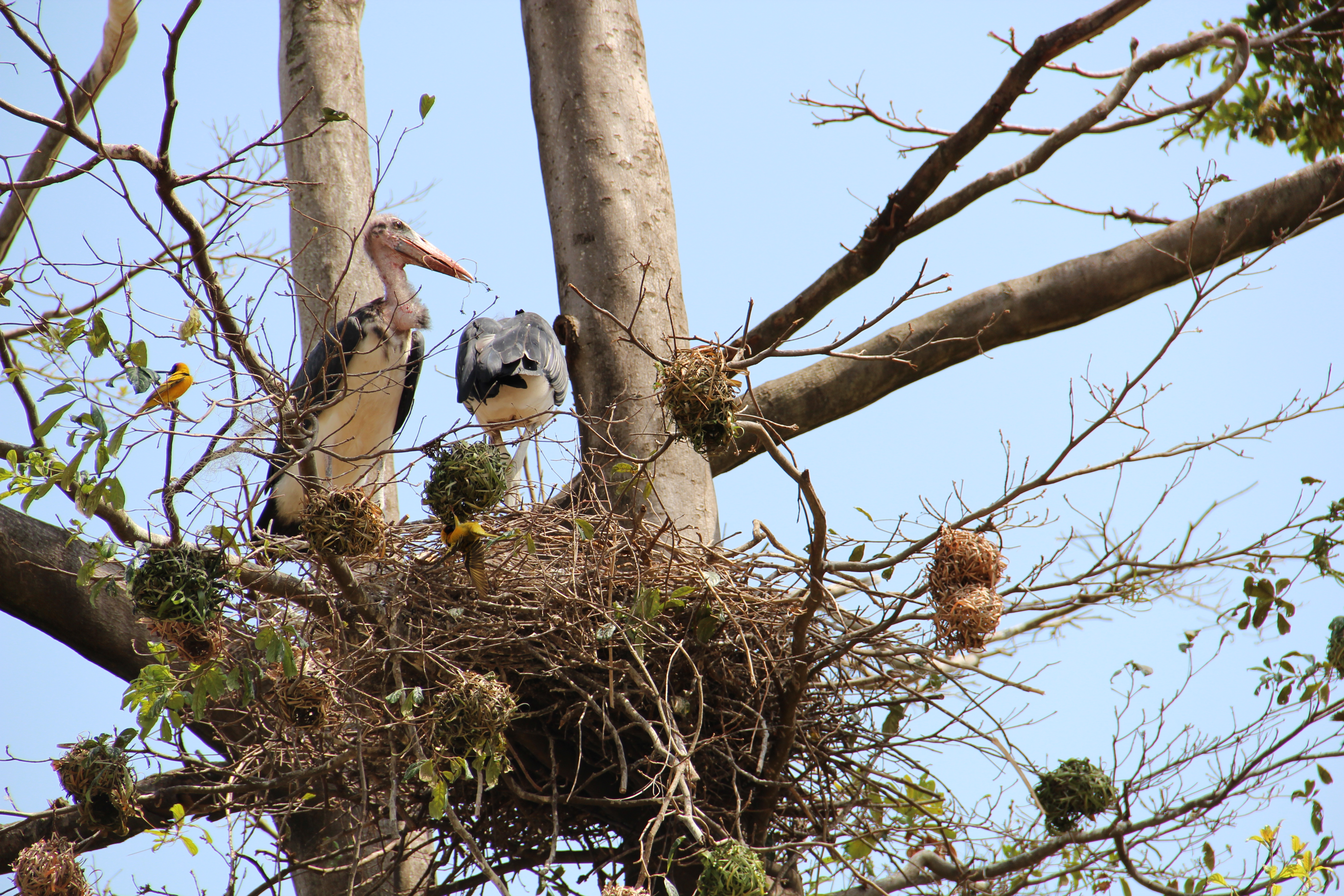 thanks again for your news,on the picture it looks like a Marabou stork, and i think the smaller nest are a member of the weaver bird family. Maybe someone will be more acurate. looking forward to your journey through this news page.