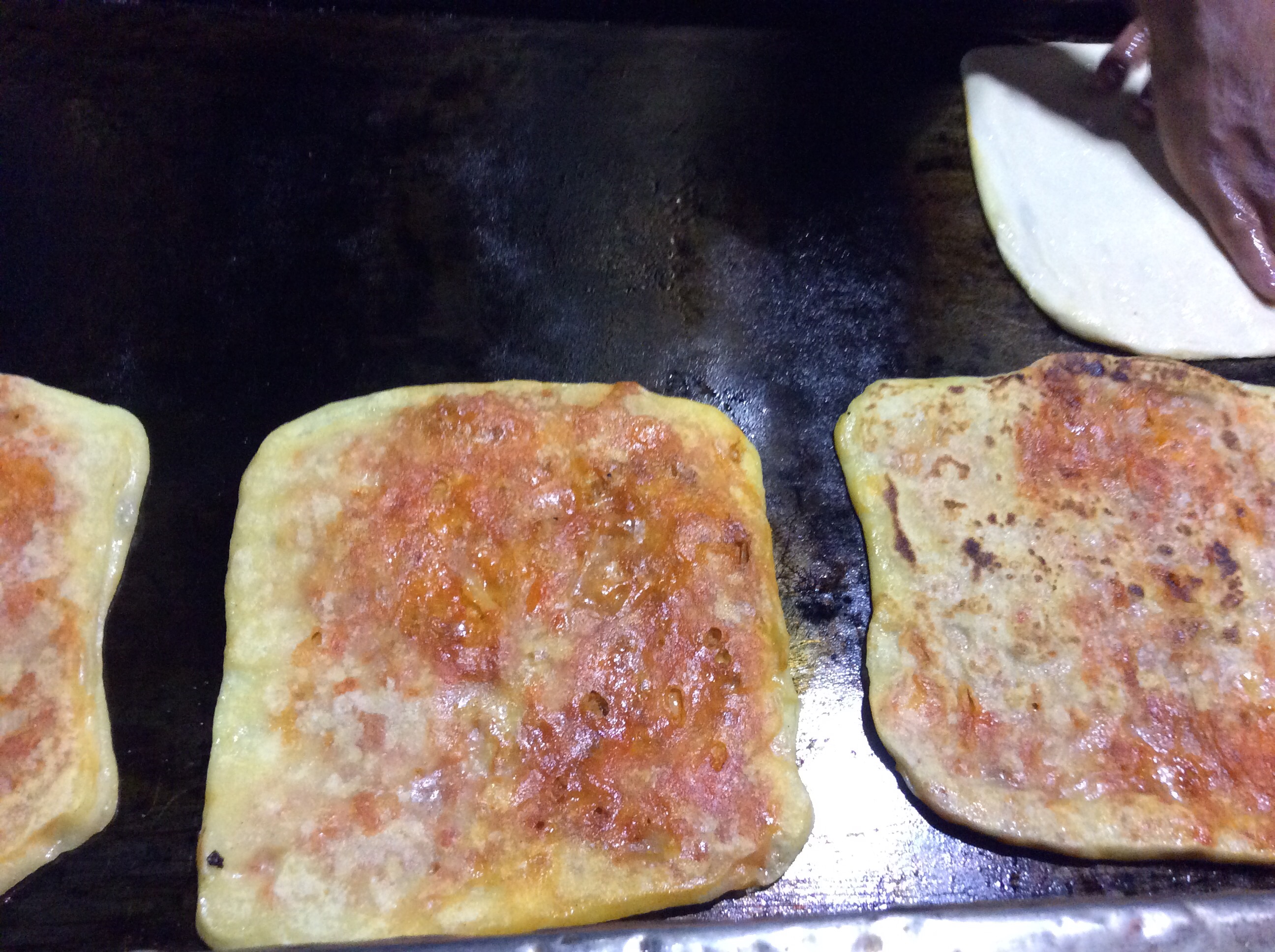 New Year’s Eve kicked off by yours truly stopping en route to dinner for a bite of street food – a delicious stuffed crepe – straight off a hot plate. I was starving and I had to eat something quickly to stave off any potential grumpiness from emerging. The crepe was like a parata only tastier because it was stuffed with chillies and olive paste.