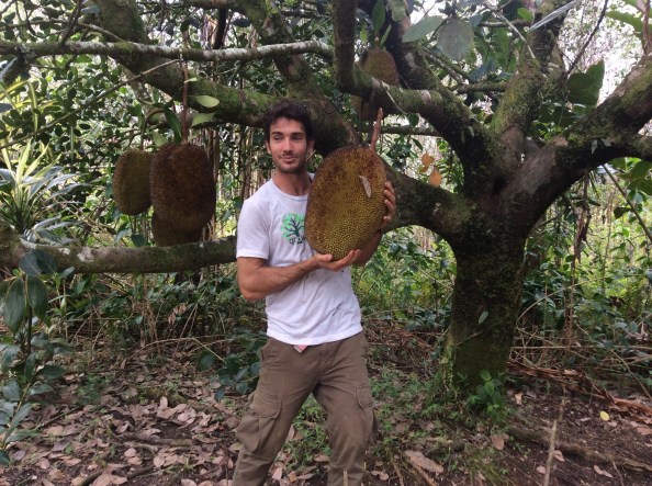 My fellow guests are 10 Americans, two Bulgarians and myself. Our ages range from 25 to 50 something. I am delighted and relieved to say that we have all bonded extremely well and everyone is excited to be here and gets on immensely well. I shall miss some of the youngsters who Ive become very good mates with. This is Anthony Anderson, our host for the week, who is big into permaculture and the concept of growing your own paradise in your backyard and keeping life simple. He is holding jackfruit cut straight off the tree.