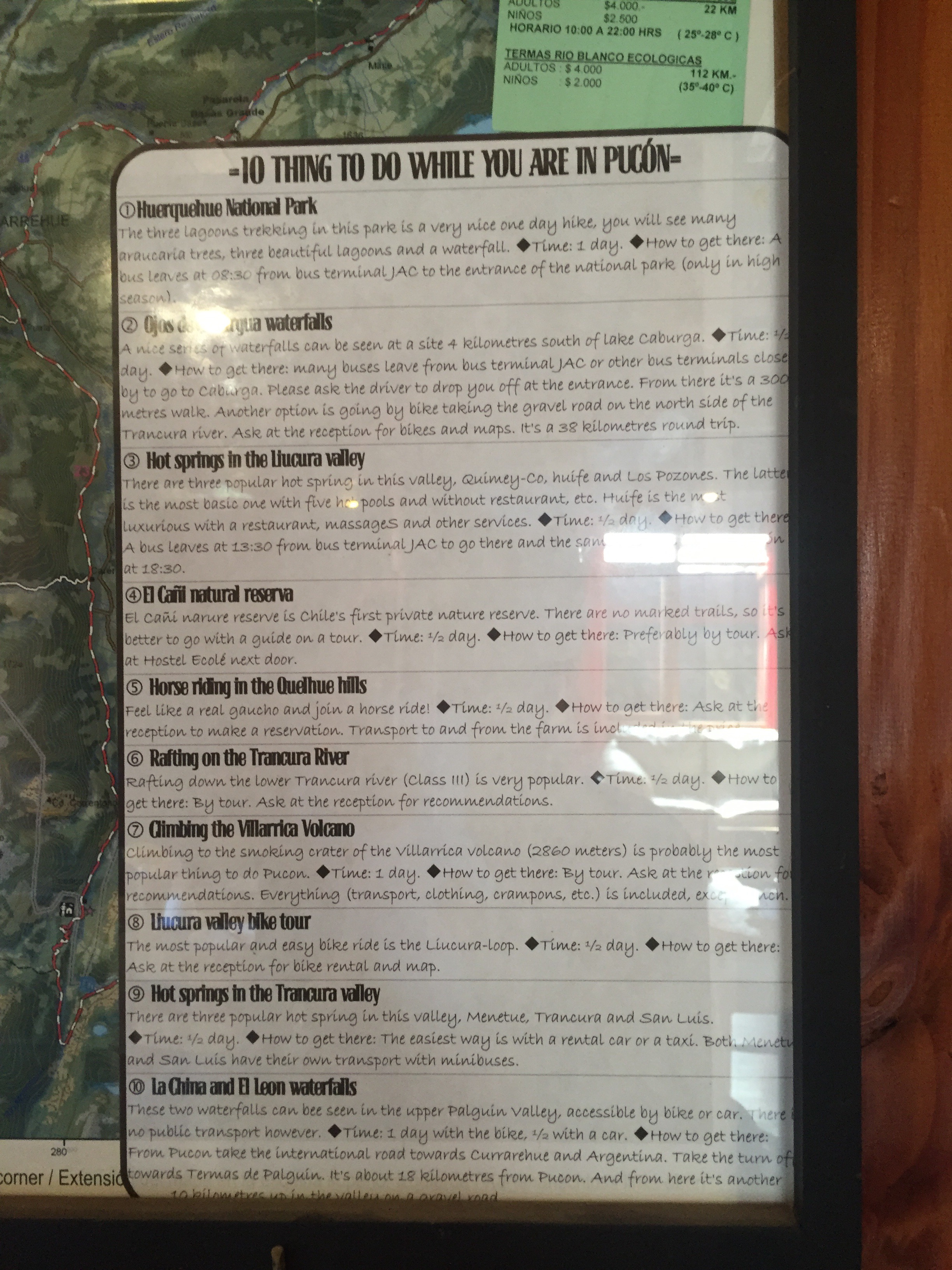 Posters in all of the windows showed white water rafting, hiking and summiting the Volcano Villaricca. This place is where active and adrenaline-craved people descend.