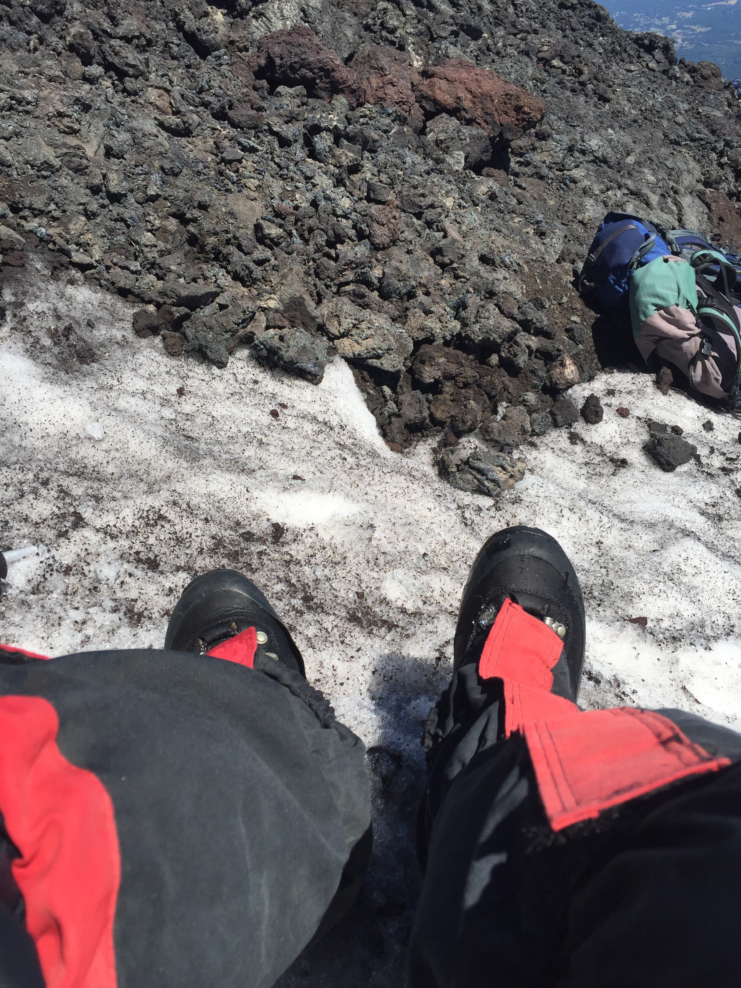 I was scooped up by the ski lift and five minutes later I found myself on a snow slope for the first time in 12 years. Every step I took I was concentrating so hard on not slipping. If you fall over and start sliding down the volcano the only way to stop is to dig your snow axe into the mountain face and cling on. That thing is your best friend. It also acts as a brake on the way down….more on that later.